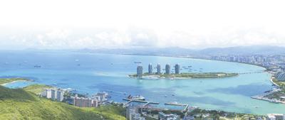 海南三亚湾,碧波荡漾,辽阔无垠。凭高而望,三亚河自北向南入海,绵延的海岸线伸向远方,海天一色,美不胜收。