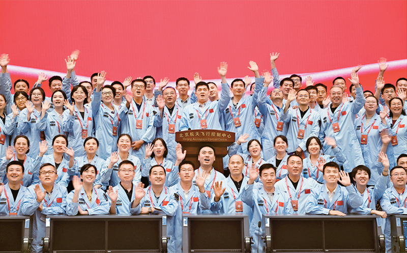 嫦娥六号完成了人类历史上首次月球背面采样,突破了多项关键技术,是我国建设航天强国、科技强国取得的又一标志性成果,是我国探月工程的重要里程碑。图为2024年6月25日,嫦娥六号任务圆满成功后,工作人员在北京航天飞行控制中心合影。 新华社记者 金良快/摄