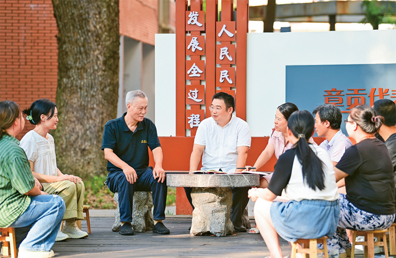 江西省赣州市章贡区高标准推进基层立法联系点建设运行,通过“开门立法”等方式,有效架起社情民意“连心桥”。图为2024年9月9日,在章贡区南外街道红环路社区,当地立法联络员同社区居民进行交流,就相关法律立法进行意见征询。 人民图片 胡江涛/摄