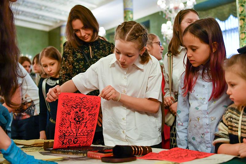 2023年6月2日,在位于俄罗斯莫斯科的中国驻俄罗斯大使馆举行的一场中国传统文化体验活动上,一名小朋友体验雕版印刷。