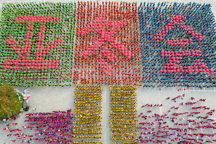 这是2023年7月8日拍摄的在哈尔滨太阳岛景区太阳石广场举行的庆祝仪式现场(无人机照片)。当日,中国哈尔滨市获得2025年第九届亚洲冬季运动会举办权。新华社记者 张涛 摄