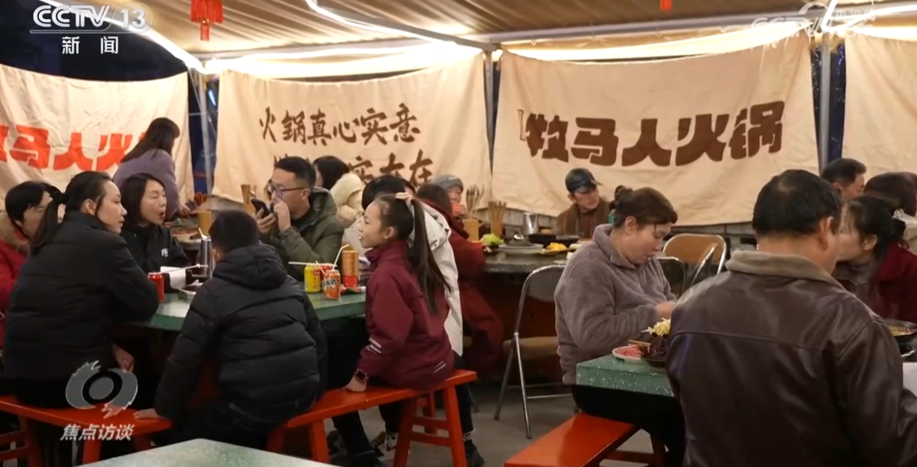 民主村社区火锅店老板林龙:“搬过来之前,我们是15张桌子左右,现在有了这么好的场地,已经扩大到33张台。重新开店以后,招工这一块人社部门也给予了我们很大支持。”