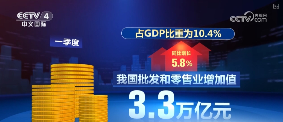 商务部数据显示,一季度,中国批发和零售业增加值3.3万亿元,同比增长5.8%,占GDP比重达到10.4%。