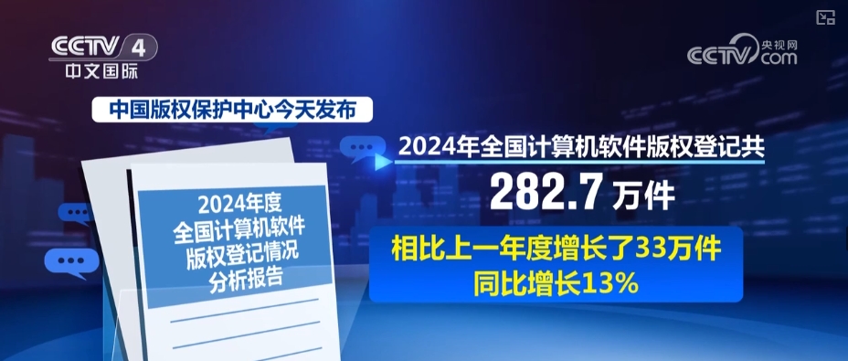 中国版权保护中心4月21日发布《2024年度全国计算机软件版权登记情况分析报告》。显示,2024年全国计算机软件版权登记共282.7万件,相比上一年度增长了33万件,同比增长13%,再创历史新高。