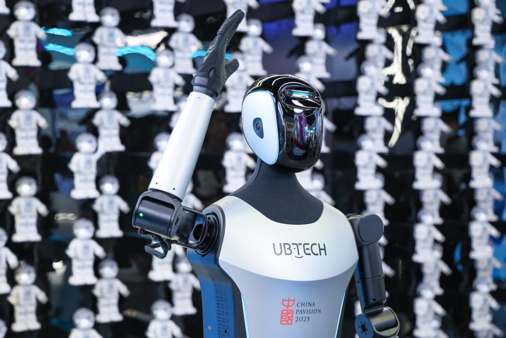 △ 2025年4月23日,在深圳优必选科技展厅内,商用版人形机器人Walker C向观众挥手致意。