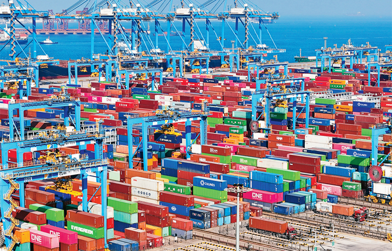 贯彻落实中央经济工作会议精神,要有序扩大自主开放和单边开放,以高水平对外开放促改革、促发展。图为2024年12月23日,在山东港口青岛港全自动化码头,高速轨道吊在集装箱堆场运送货物。 中新社发 张进刚/摄