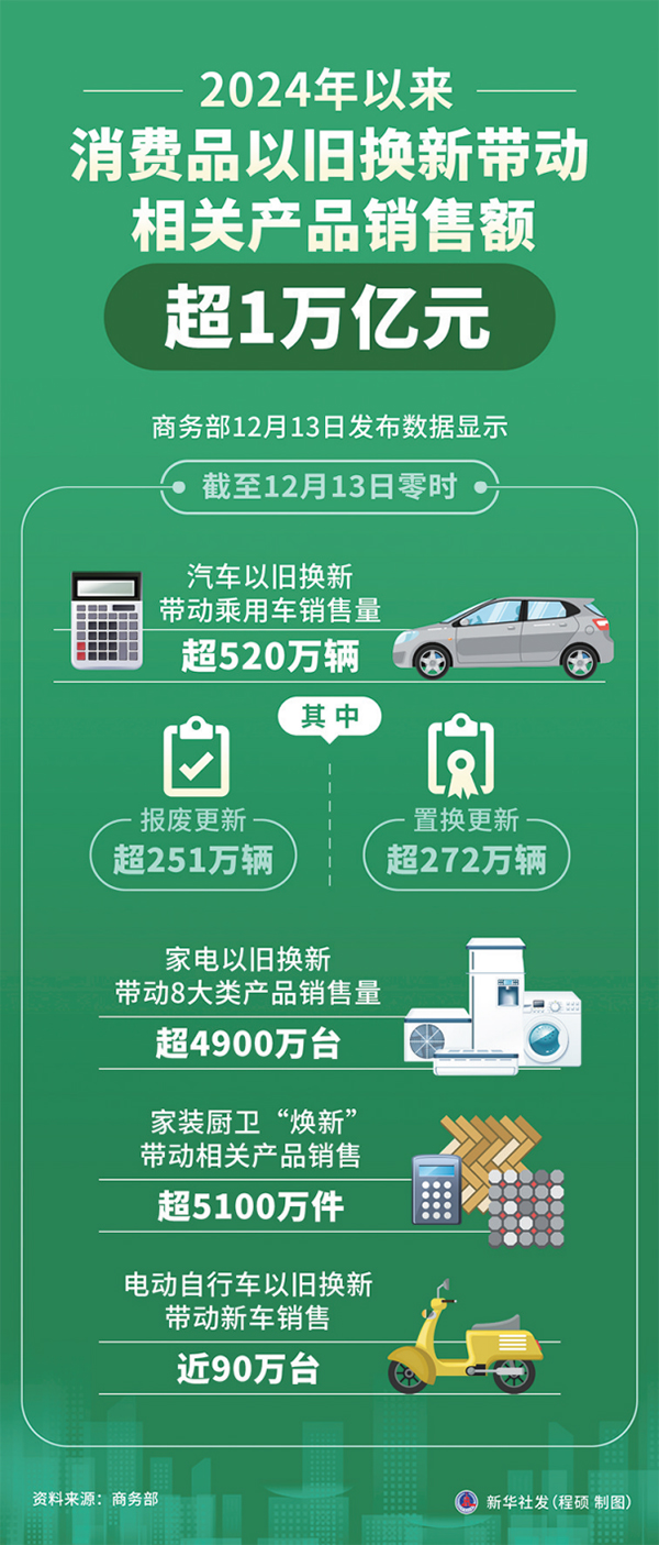在外部环境不确定性上升情况下,推动经济回升向好需要更多依靠内需特别是消费需求。2024年以来,我国消费品以旧换新政策整体带动相关产品销售额超1万亿元。 新华社发 程硕/制图