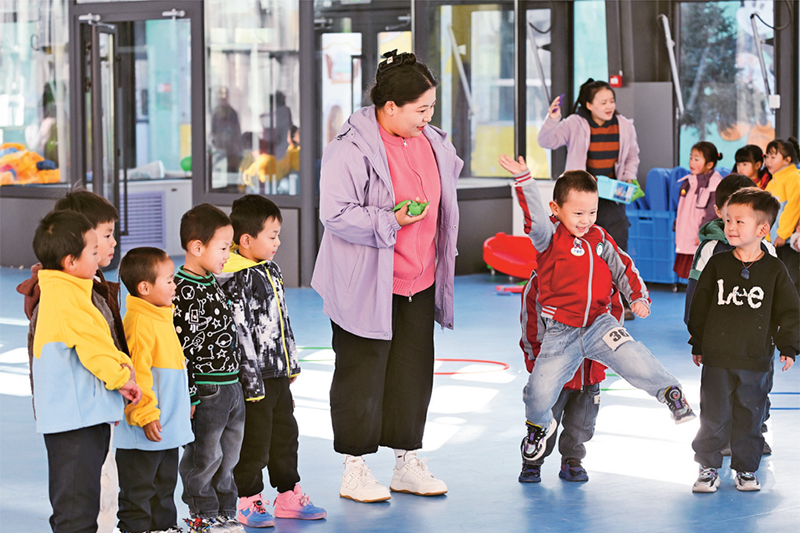 近年来,各地不断加大学前教育保障力度,逐年完善幼儿园布局和建设规划,增加普惠学前教育学位供给,促进幼教队伍能力提升,推动学前教育普及普惠优质发展。图为2024年11月14日,在青海省海西蒙古族藏族自治州天峻县民族幼儿园,小朋友们在老师带领下上体育课。 新华社记者 张龙/摄