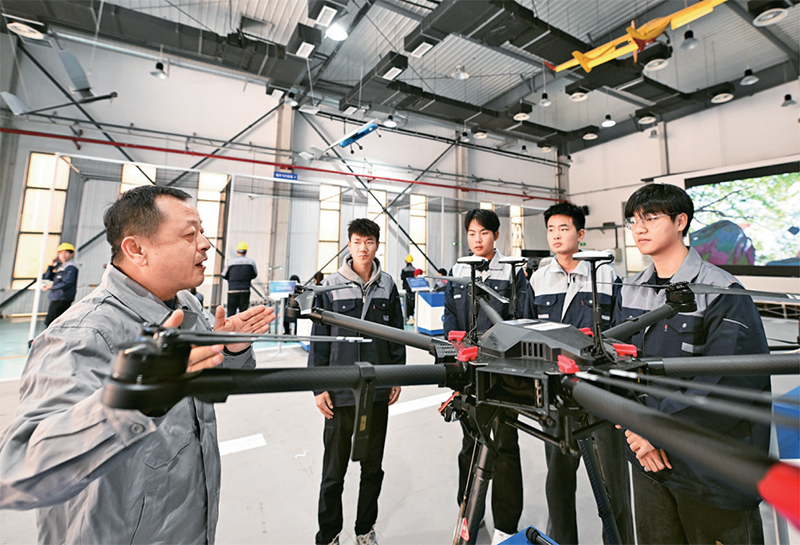 以应对老龄化、少子化为重点完善人口发展战略,促进人口高质量发展,还应在加快培育现代化急需的人力资源,提高劳动力的配置效率和匹配水平,解决好结构性就业矛盾上下功夫。近年来,各地注重以就业市场需求为导向,通过校企联合办学,搭建产教联合体等形式,拓宽职业教育毕业生就业渠道。图为2024年11月12日,天津现代职业技术学院老师在无人机产教融合实践中心指导学生。 新华社记者 赵子硕/摄