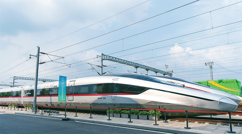 “十四五”时期,以CR450动车组为代表的一项项重大技术装备项目取得新进展、实现新突破。CR450动车组试验速度可达450公里/小时,运营速度可达400公里/小时,是全球跑得最快的高铁。图为2025年7月9日,在国家铁道试验中心展区拍摄的CR450BF动车组。 新华社记者 才扬/摄
